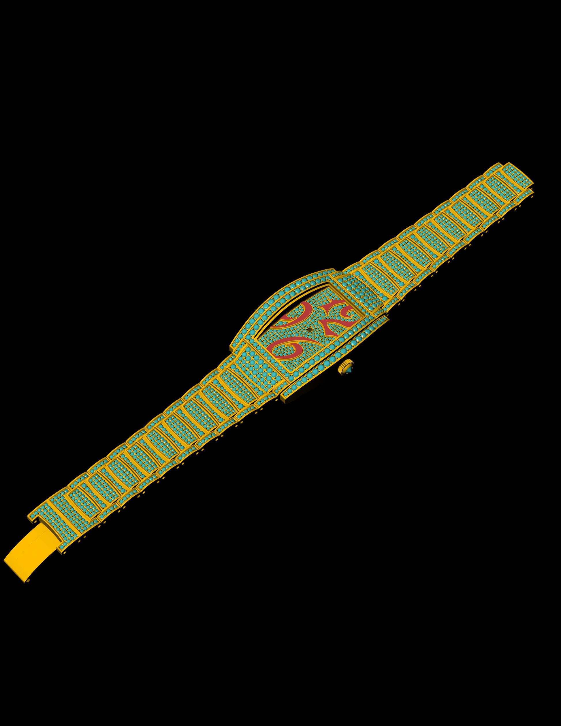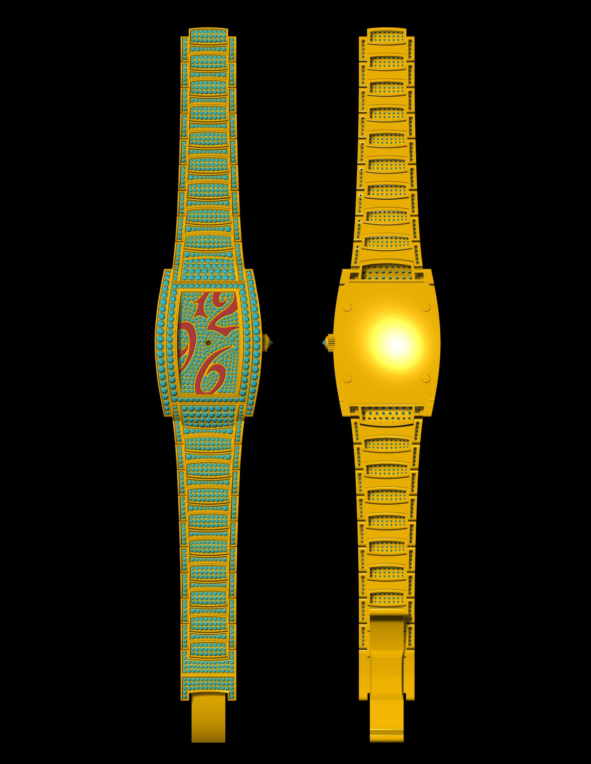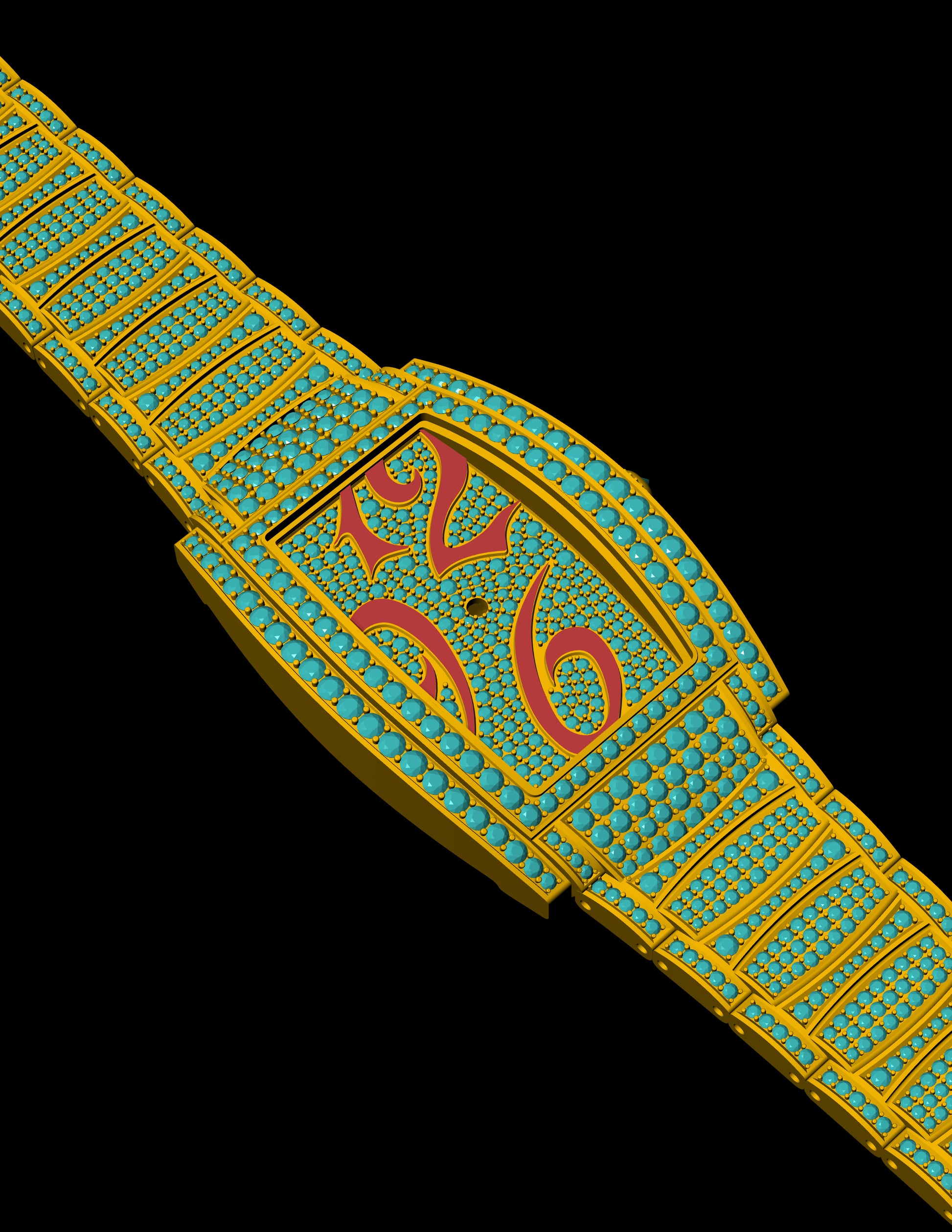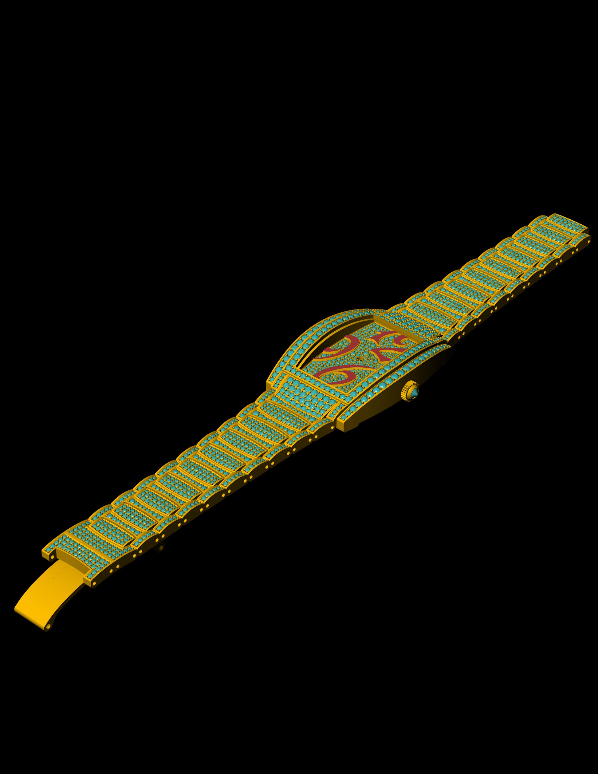 Elevate your design portfolio with this luxury watch CAD file, featuring a curved rectangular dial, bold artistic numerals, and a fully stone-studded band. This high-detail 3D model is perfect for jewelry designers, manufacturers, or 3D artists working in the luxury watch space.