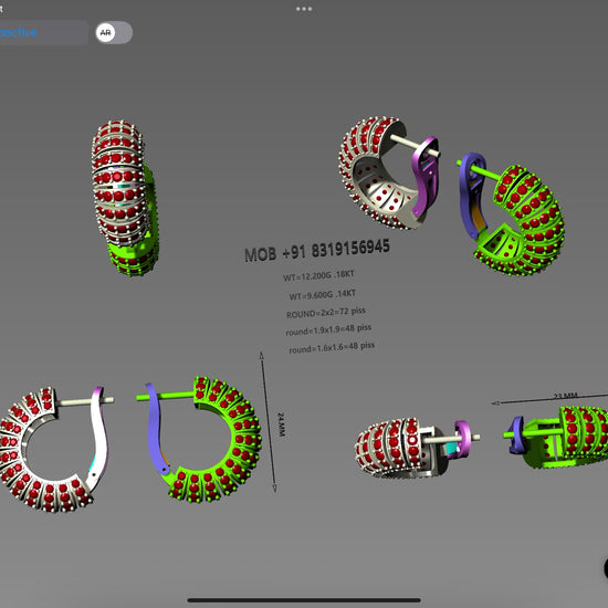A finely crafted CAD design of elegant ruby-studded hoop earrings featuring dual metal options (18KT – 12.200g & 14KT – 9.600g). The design showcases intricate round stone placements — 2.0mm×72 pcs, 1.9mm×48 pcs, and 1.6mm×48 pcs — delivering a perfect balance of symmetry and brilliance. Ideal for fine jewelry manufacturers seeking precision in both form and detail.