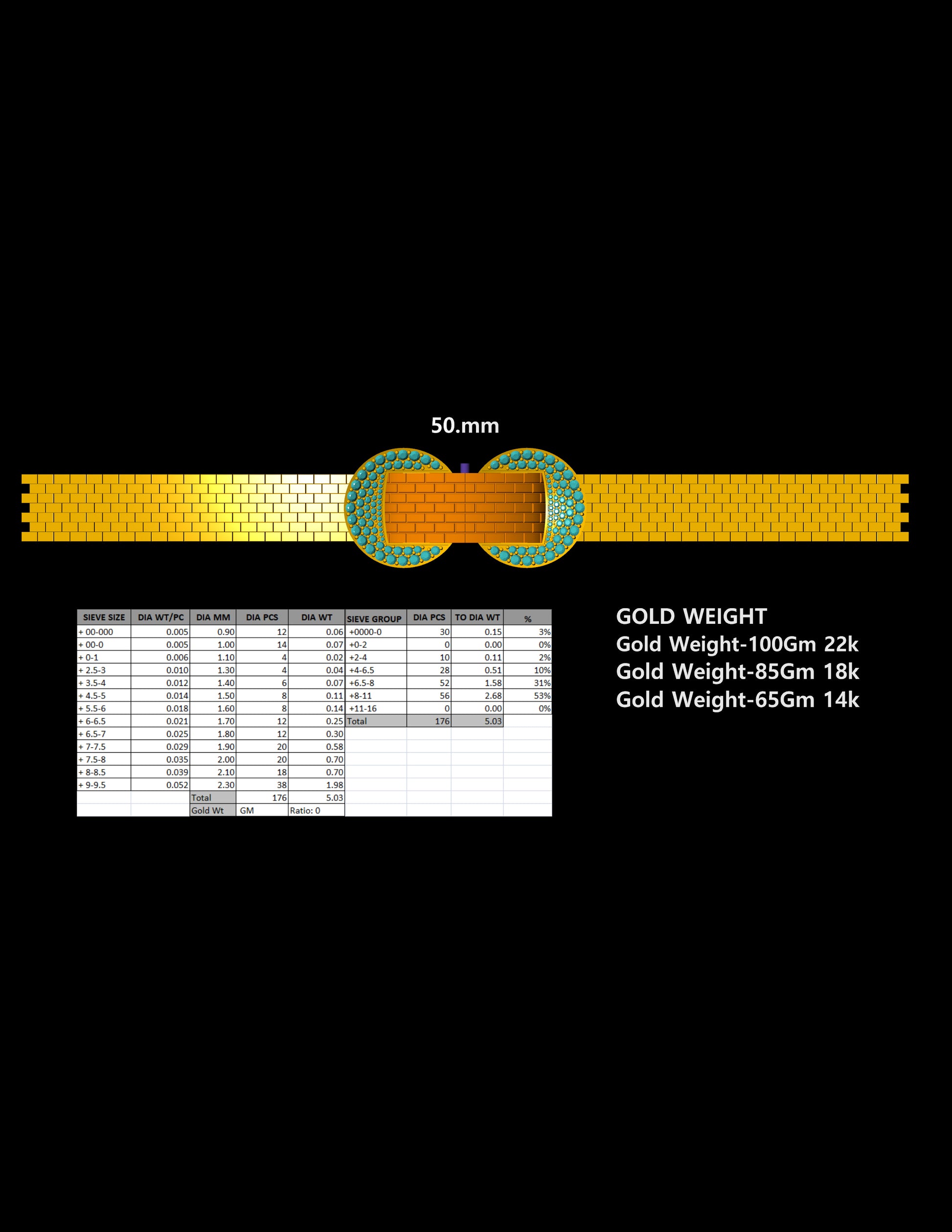 - Gold Weight: ~100g (22K), ~85g (18K), ~65g (14K)