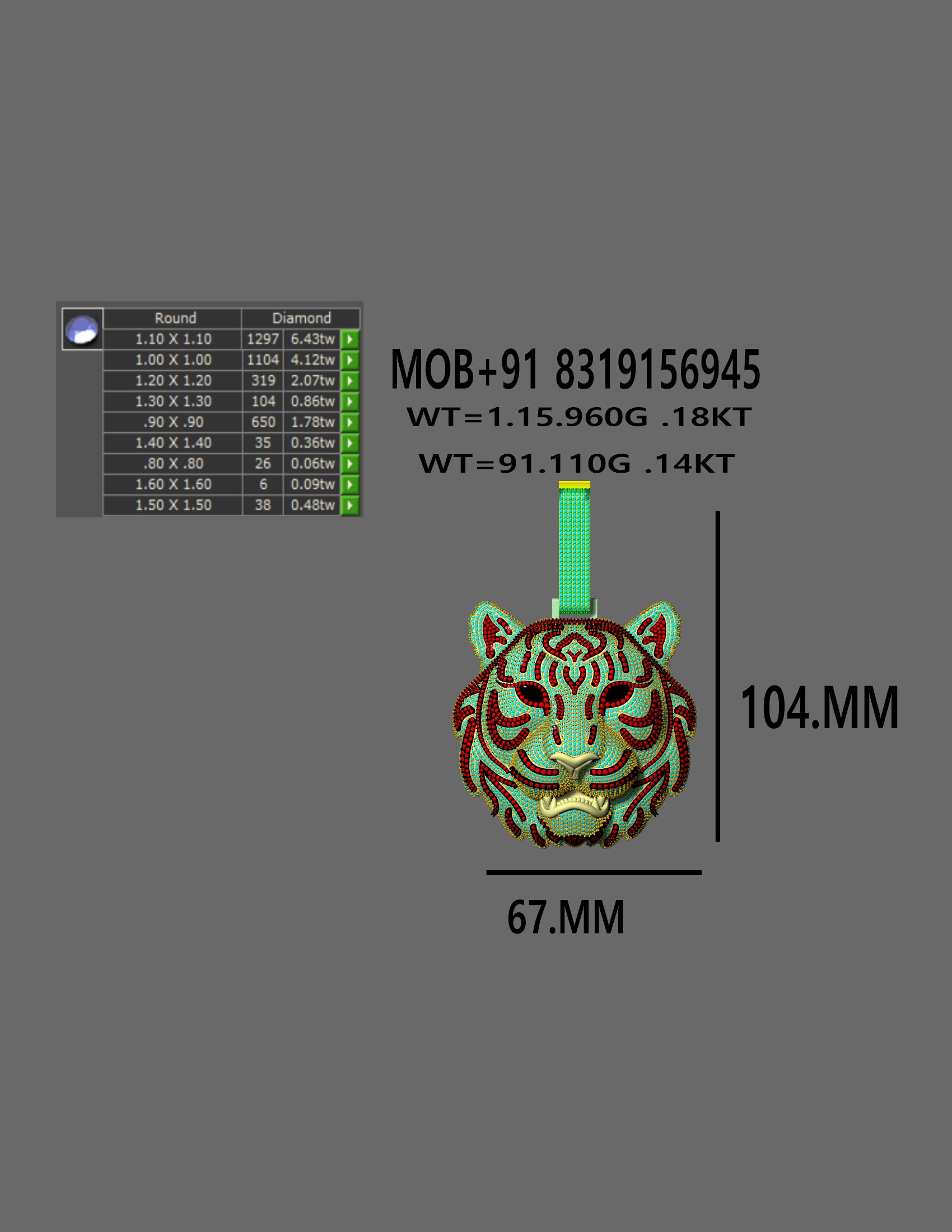 This exquisite Tiger Head Pendant is crafted as a bold statement piece, combining intricate artistry with refined technical precision. Designed with a detailed open-work structure, the pendant features a three-dimensional tiger motif highlighted by a rich arrangement of micro-pavé round diamonds. Each contour of the face—eyes, whiskers, and stripes—is meticulously shaped to create a powerful and elegant expression.