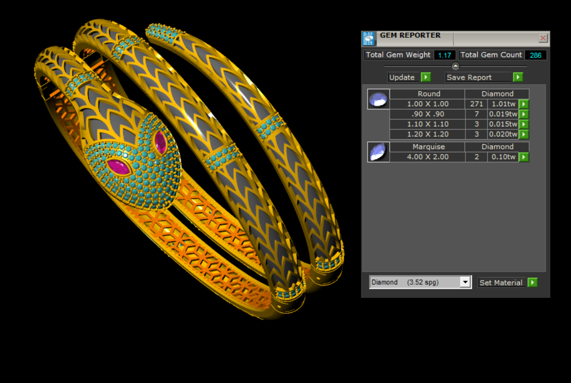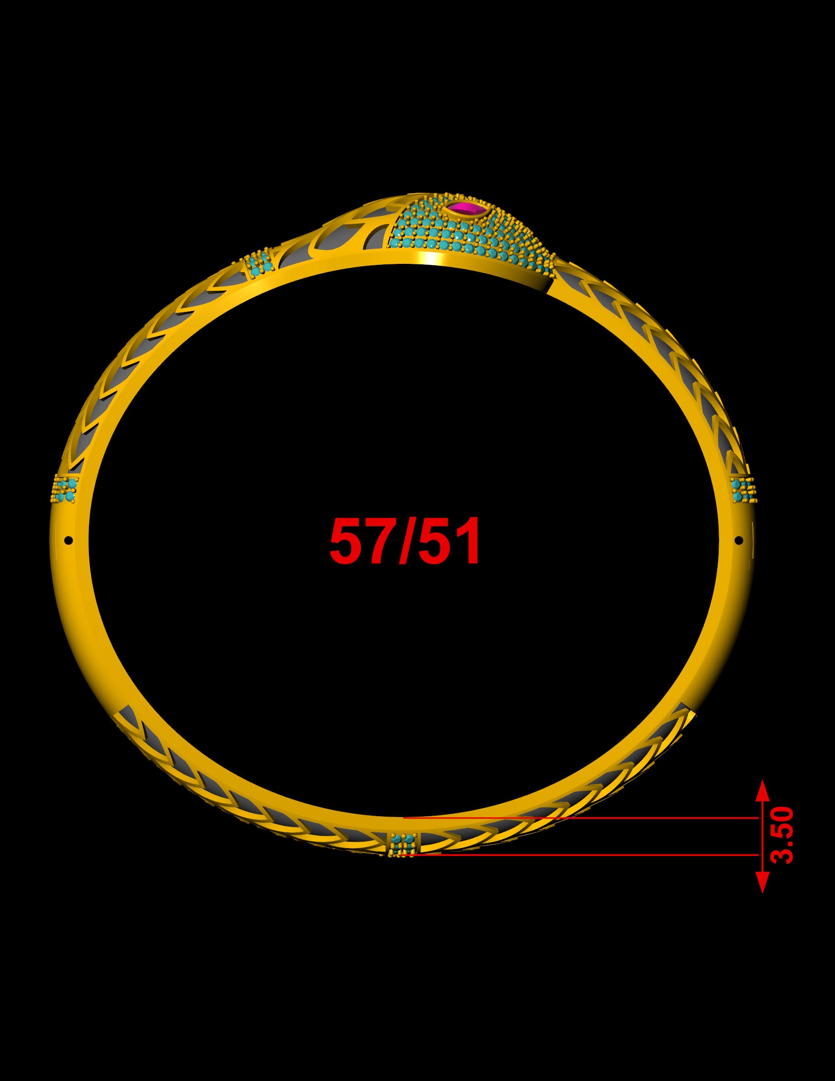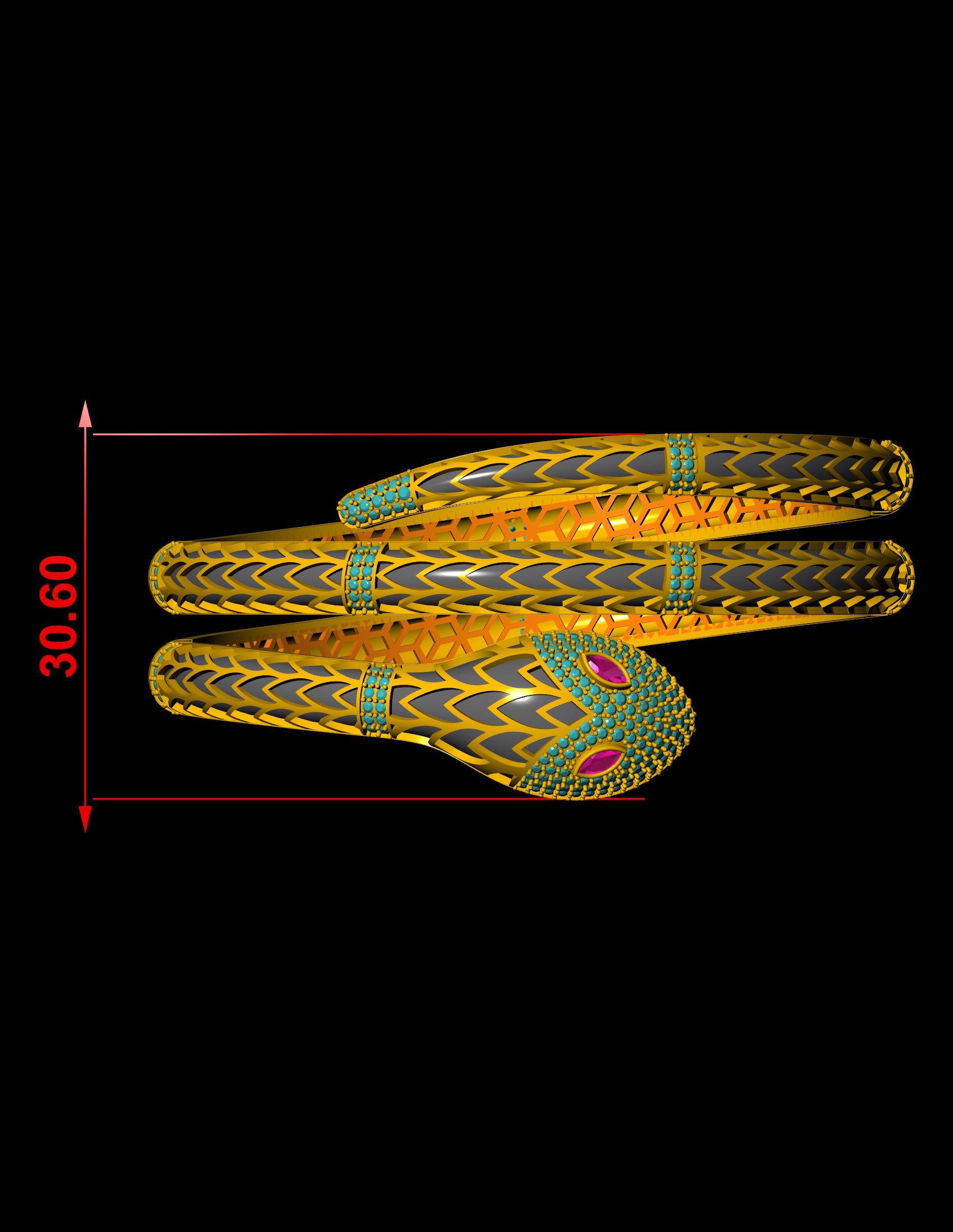 This elegant bracelet CAD file captures the essence of high-end design with a bold serpentine silhouette. The structure features a sculpted snake-like head adorned with marquise-cut gemstone “eyes” and pavé-set round stones along the coiled form. Engineered with a three-part hinged mechanism, this design offers both visual impact and wearable flexibility—ideal for luxury production.