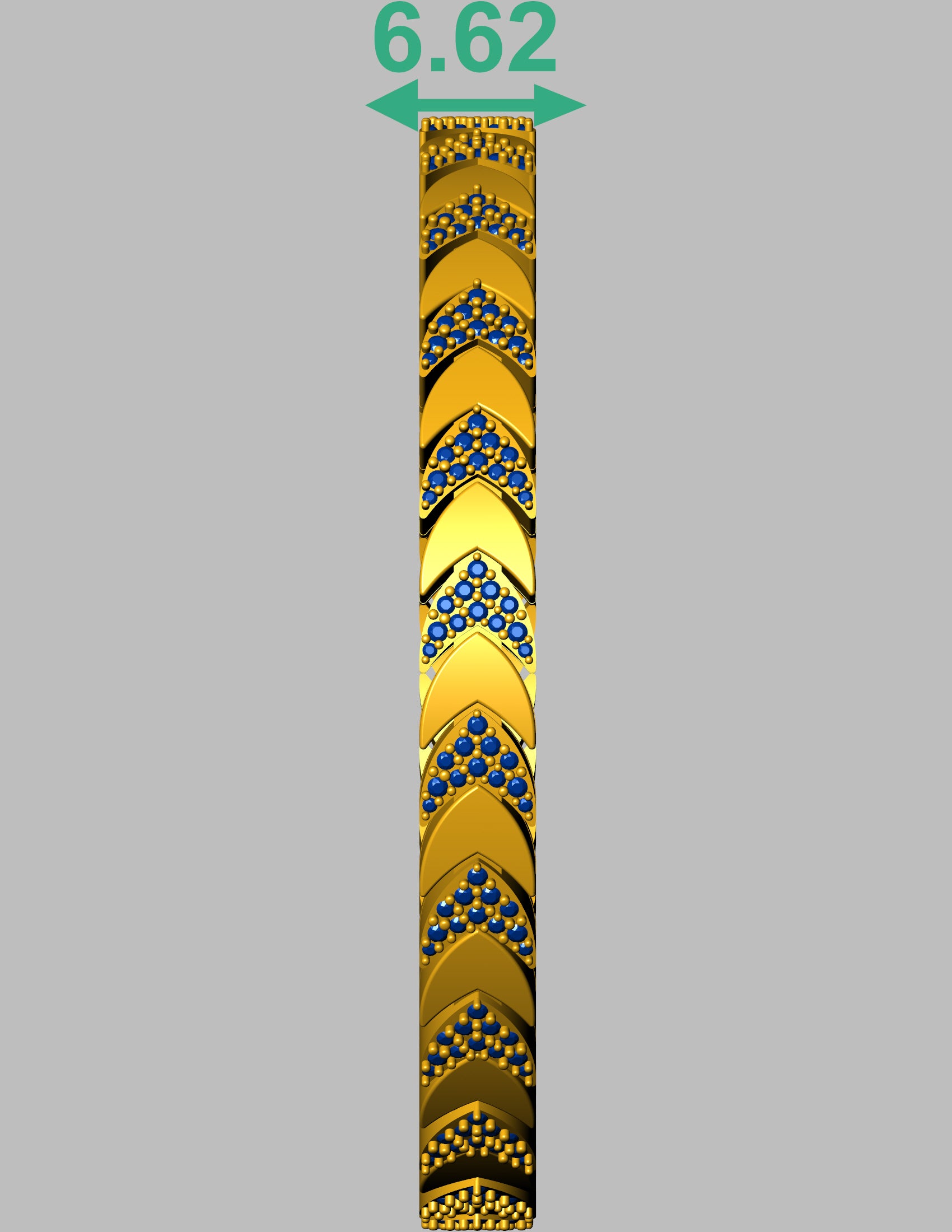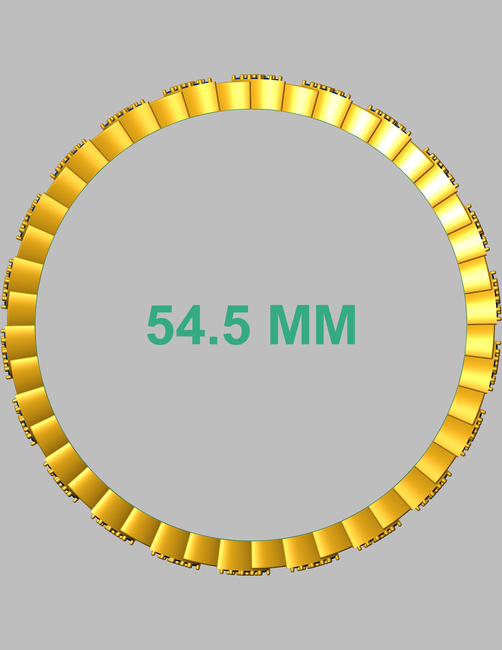 This downloadable CAD file features a flexible chevron-style bracelet engineered with a hidden internal spring mechanism, allowing for natural expansion and a secure, clasp-free fit. The design is ideal for 18K gold, with an estimated metal weight of 38.50 grams and an inner diameter of 54.5 mm.