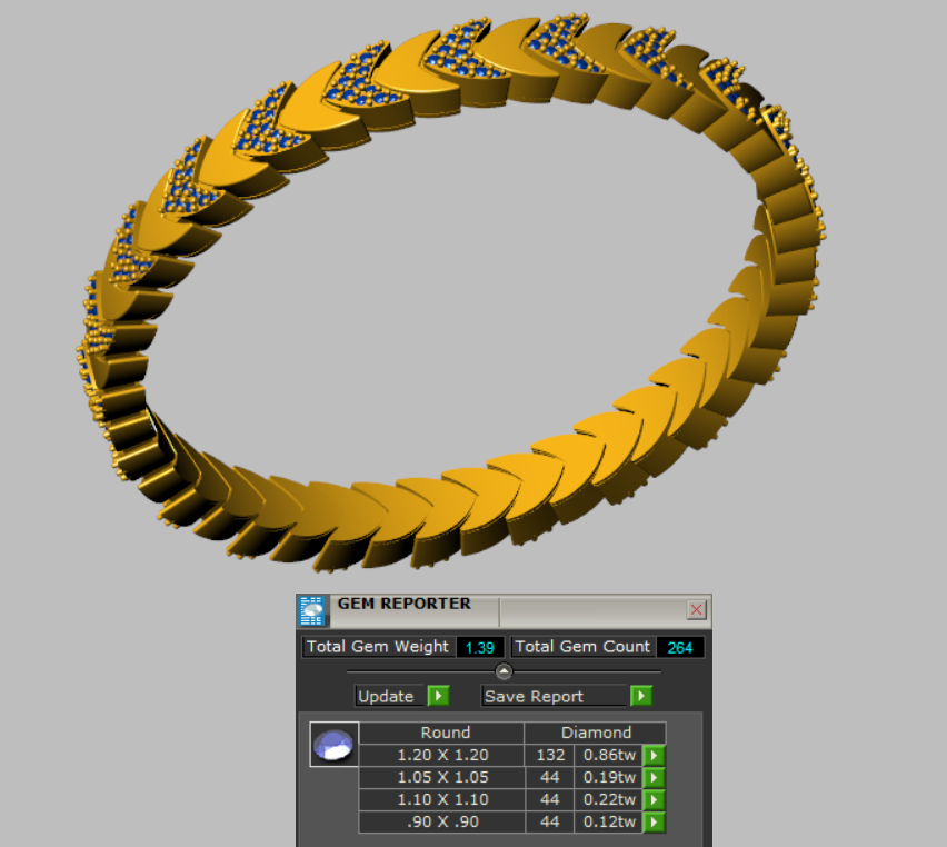 The bracelet is pavé-set with 264 round stones, sized for a total gemstone weight of 1.39 carats, and designed to maintain stretchability without compromising structure. The modular link system is fully modeled for precision manufacturing using 3D printing or CNC milling.