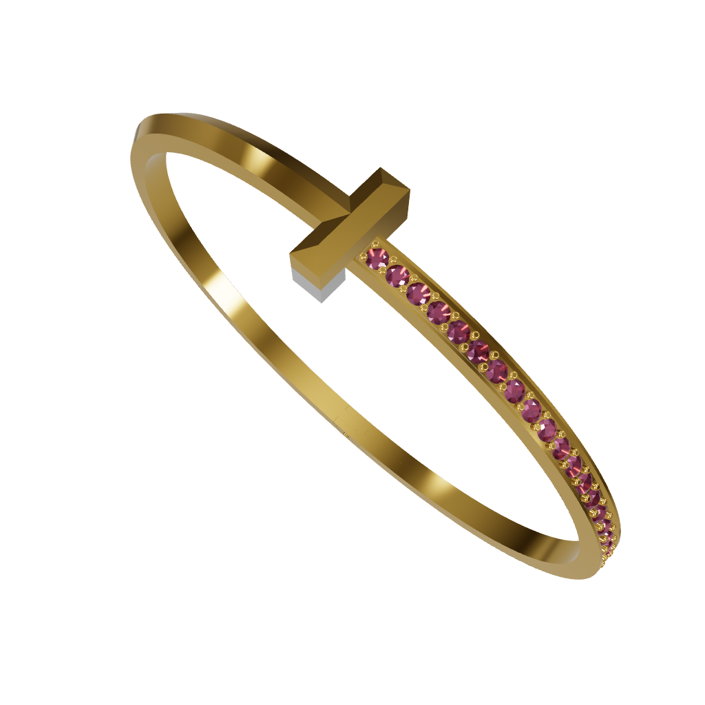 Inspired by the elegant Tiffany T Narrow Hinged Bangle, this CAD model features a minimalist “T” bar front with a refined pavé diamond strip along one side of the arc. Designed for 18K gold, the piece weighs approximately 15 grams and holds 40 round diamonds (1.80 mm), totaling around 0.87 carats.