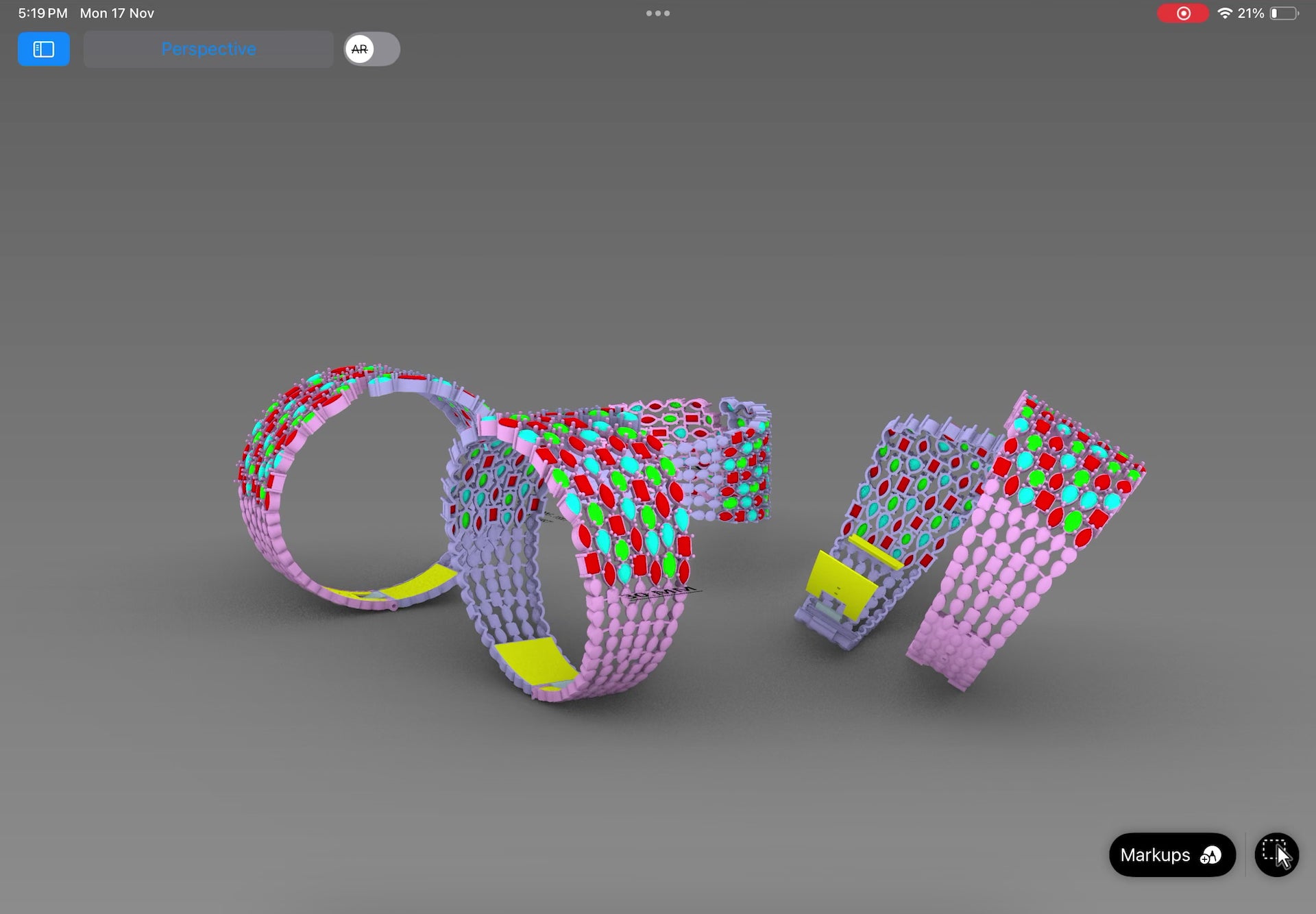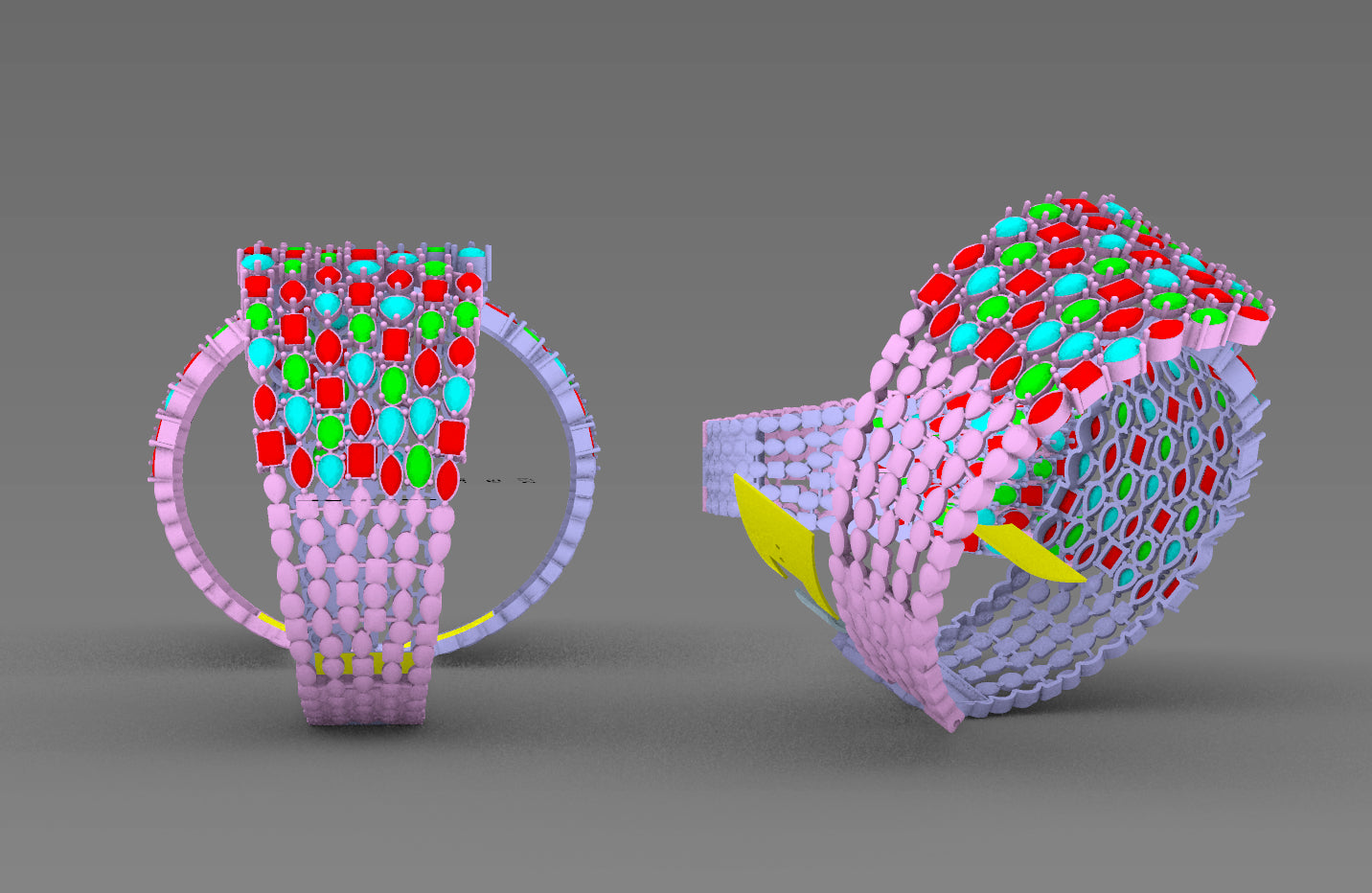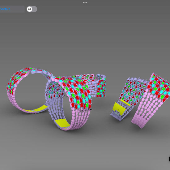 A meticulously crafted CAD bracelet featuring a vibrant mosaic of assorted gemstone shapes, arranged in a seamless multi-row pattern for exceptional visual depth. The design follows a flexible curved structure, ensuring a comfortable and secure fit around a 60 mm inner diameter. Each stone seat is precisely engineered for balanced spacing, smooth alignment, and optimal setting strength. With a width of approximately 30 mm, this statement piece delivers a bold, luxurious aesthetic, suitable for premium production in 14KT or 18KT gold. Ideal for clients seeking a striking, high-detail designer bracelet with maximum brilliance and structural efficiency.