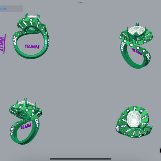 This refined CAD model presents an elegant spiral gemstone ring crafted with an organic, flowing structure. The design features a central cushion-cut stone set securely within a four-prong head, surrounded by a dynamic wrap of alternating diamond placements. The crossover band forms a balanced, sculptural silhouette that enhances both stability and visual depth.