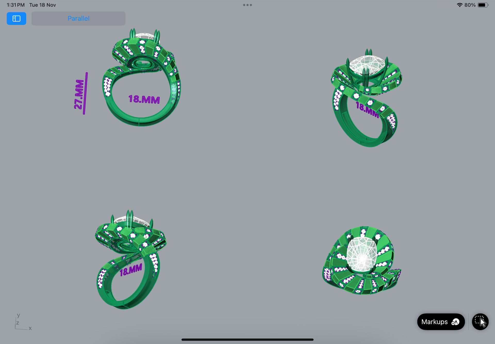 With an inner diameter of 18 mm and a total height of 27 mm, the model is prepared for precise manufacturing and accurate stone setting. The layout includes multiple round diamonds arranged in a graduated pattern, complemented by structured geometric segments for a modern organic look.