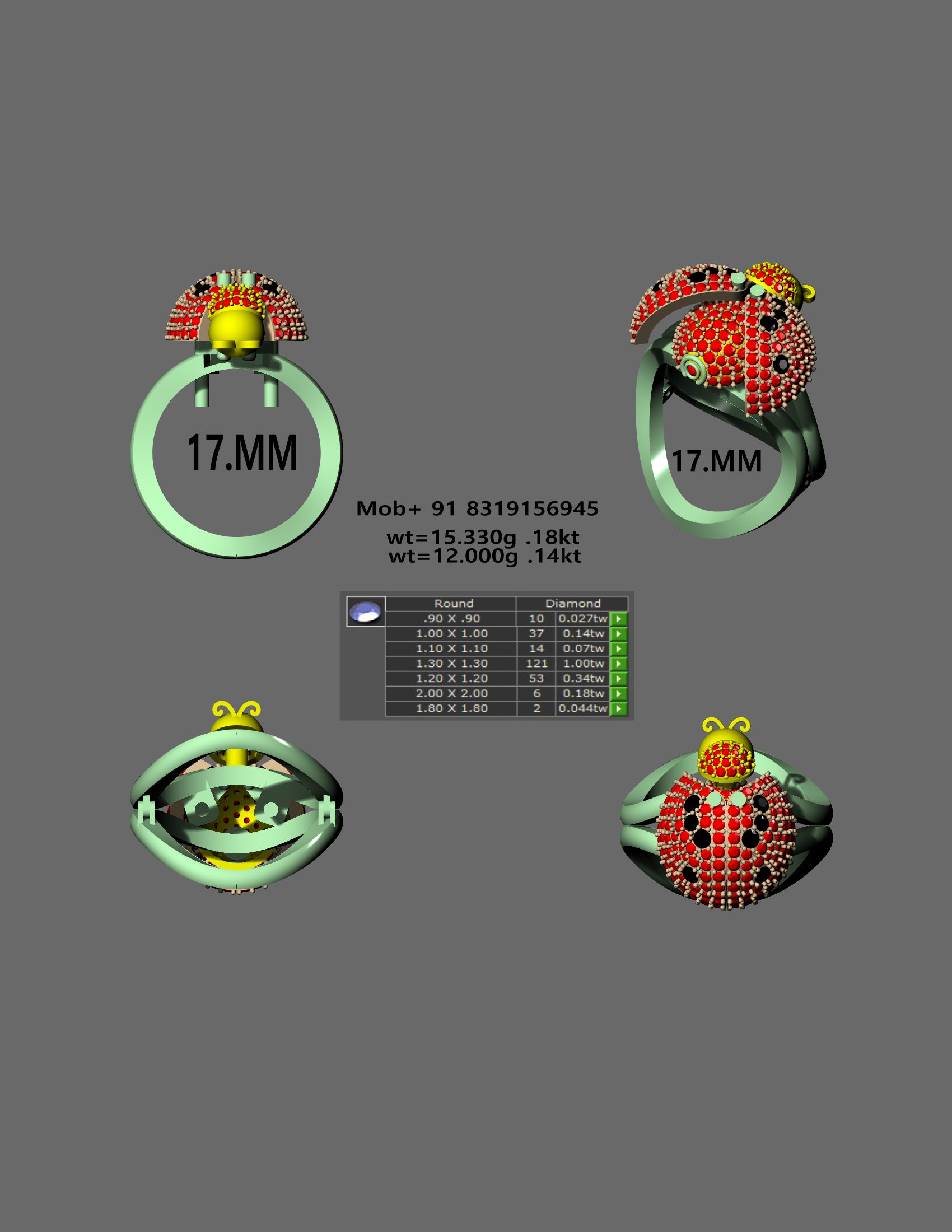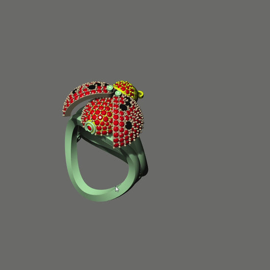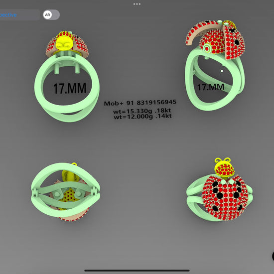 Designed with a 17 mm inner diameter, the model is available in approximately 15.330 g (18kt) and 12.000 g (14kt) metal weights. The ladybug form is intricately pavé-set with multiple stone sizes ranging from 0.90 mm to 2.00 mm, adding depth, brilliance, and a sense of natural realism. Thoughtfully engineered from every angle, this ring blends playfulness with elegance—perfect for collectors who appreciate nature-inspired artistry in fine jewelry CAD designs. contact number +91 8319156945