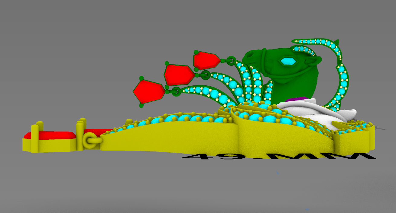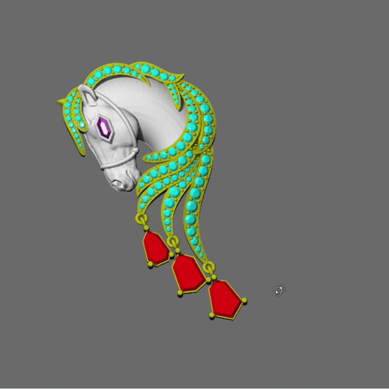 This exquisite horse-motif pendant is crafted with an artistic fusion of regal elegance and meticulous CAD precision. The sculpted equine head forms the centerpiece, detailed with refined contours and accented by a vivid gemstone eye, giving the piece a noble and captivating presence. Flowing from the head, a luxurious cascade of turquoise-set curves creates a rhythmic, ornamental movement, enhanced by three bold red drops that add a striking contrast and a sense of royal grandeur.